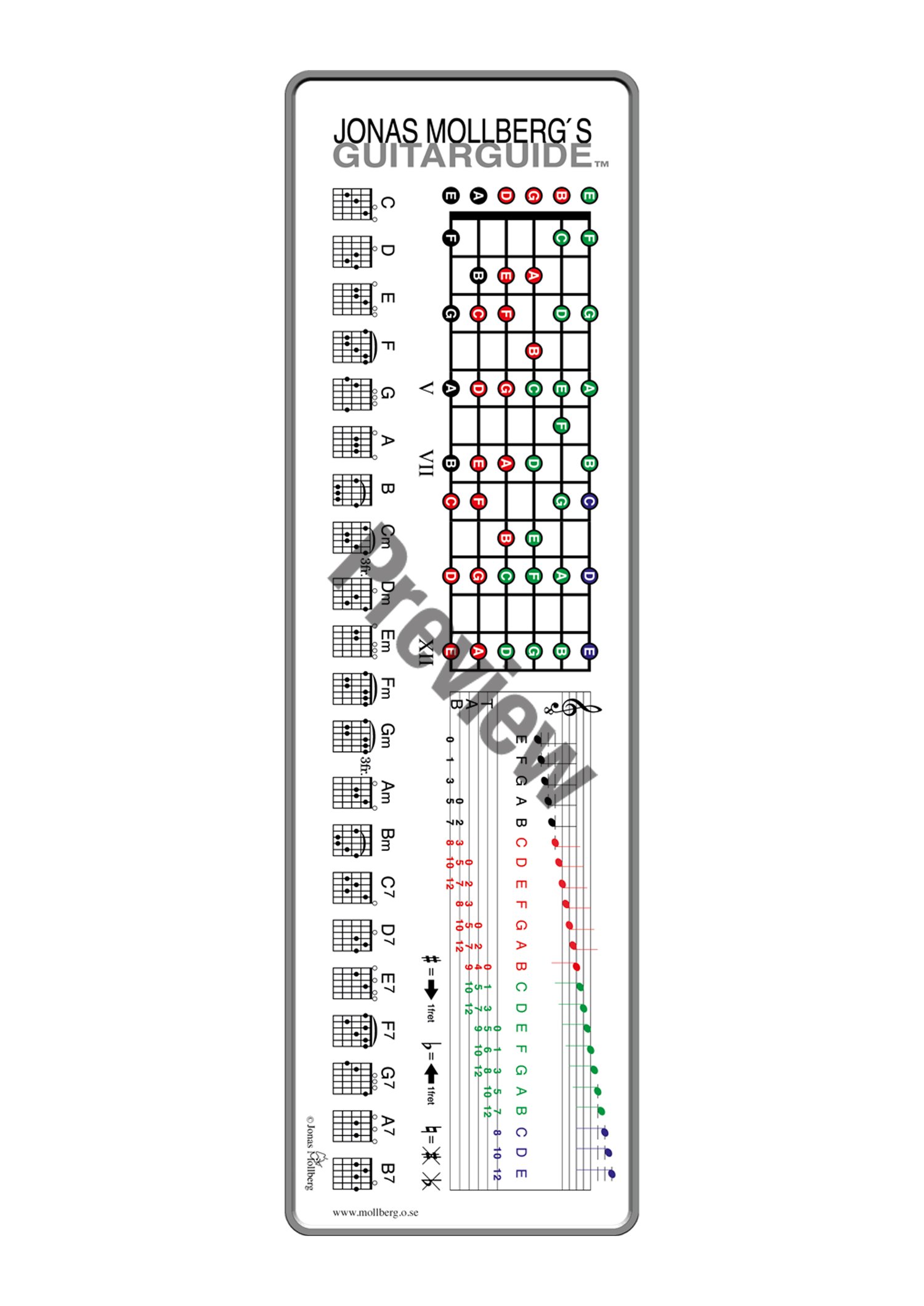 Jonas Mollberg’s Guitar Guide™ is a pedagogical tool in the form of a sticker which you put on the top of the frame of the guitar. The guide is available in two versions, one where the seventh note of the scale is called B, and one where it is called H. (mainly for Germany and the Scandinavian countries).